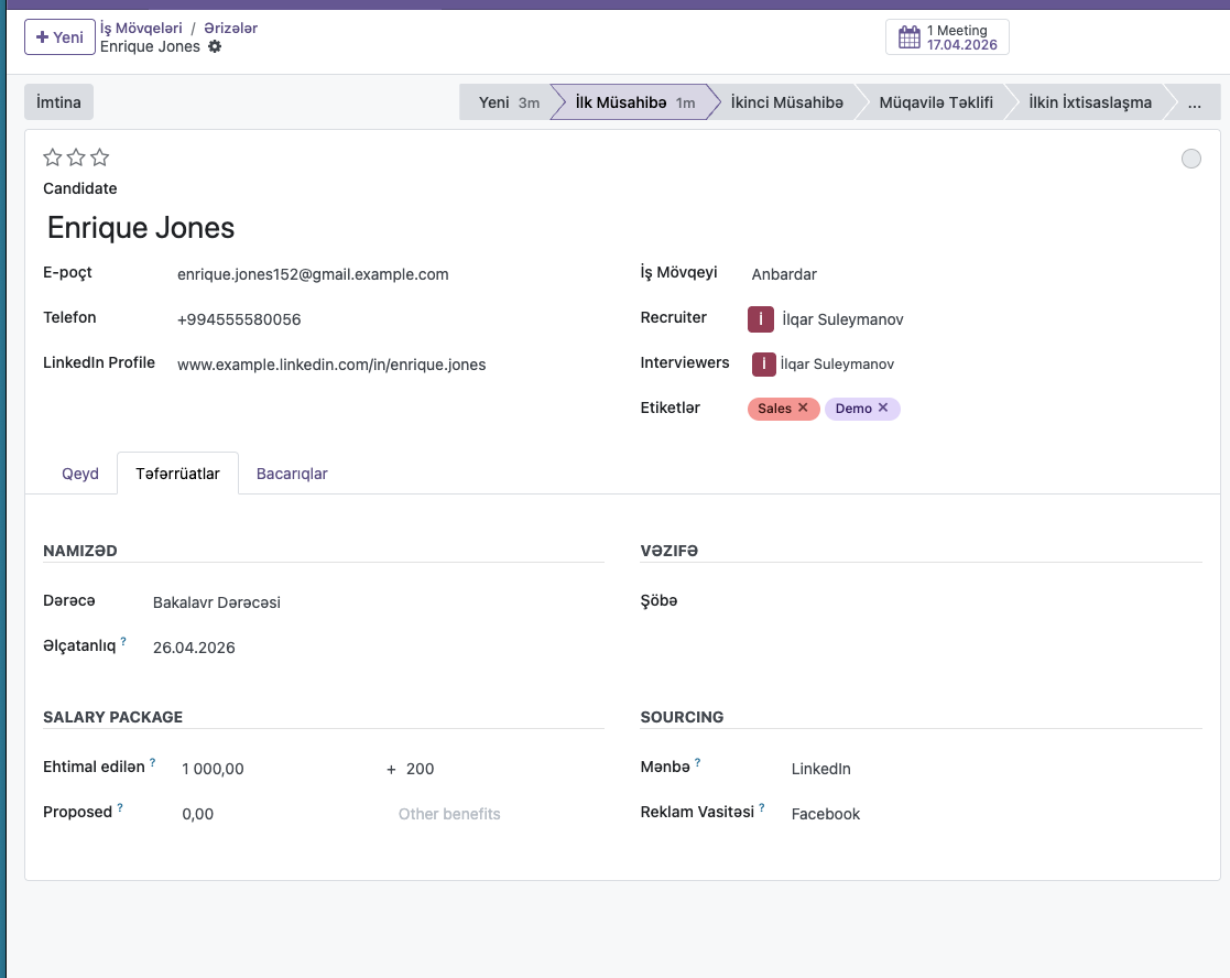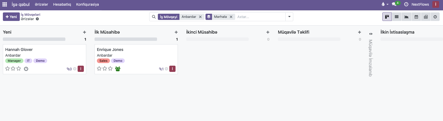 İşə qəbul prosesi 0-dan sona qədər qeyd edilir, həmçinin daxil olan müraciətlər üçün bildirişlər və xatırlatmalar alınır.